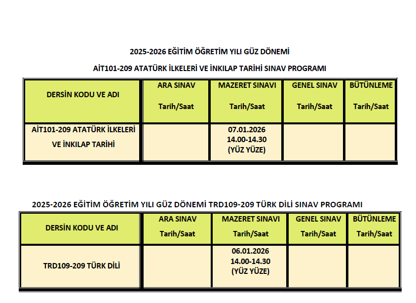 2025-2026 Eğitim-Öğretim Yılı Güz Yarıyılında yapılacak olan TRD109-TRD209 kodlu Türk Dili ile AİT101-AİT209 kodlu